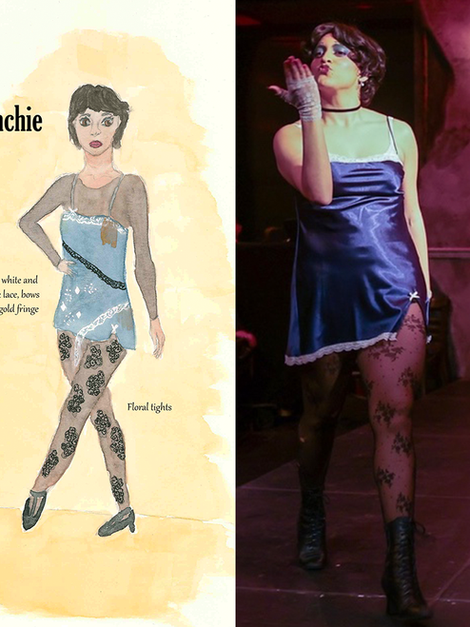The original notes for the production were "trunk show" and "found objects". The first designs for the Kit Kat girls consisted of dresses repaired with materials from others. Original slip dresses were ripped and repaired with the same lace, fringe, and beads.